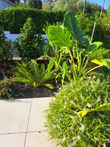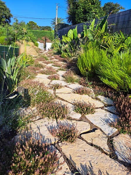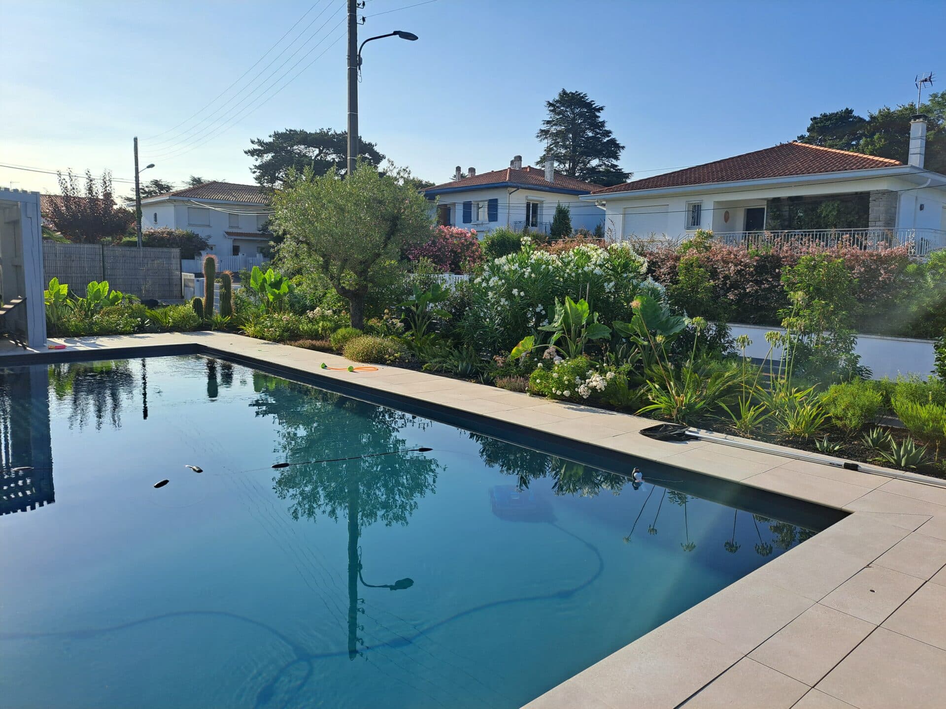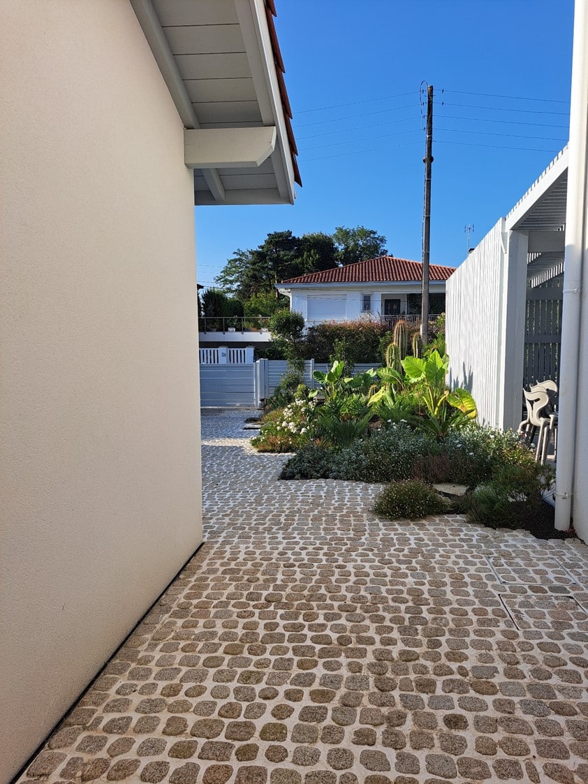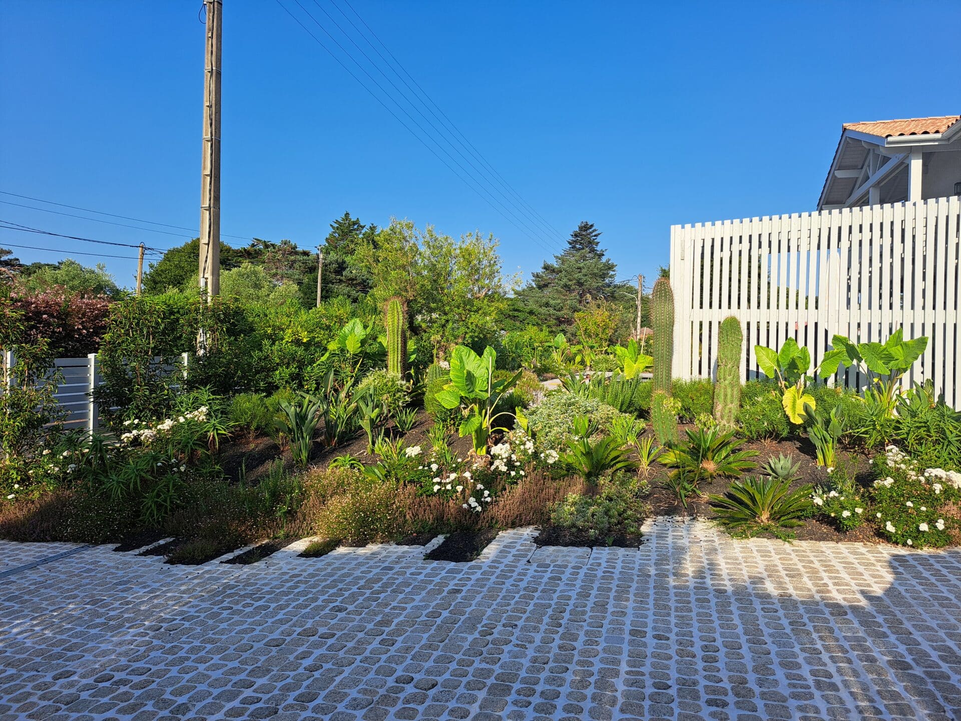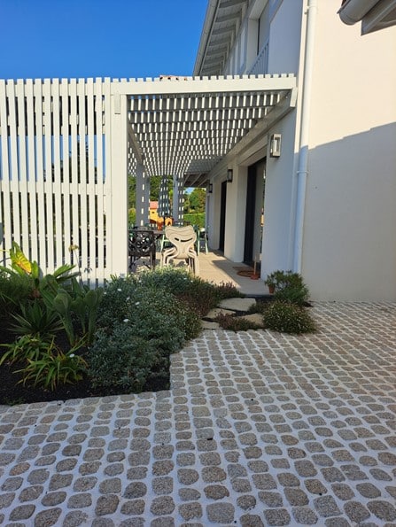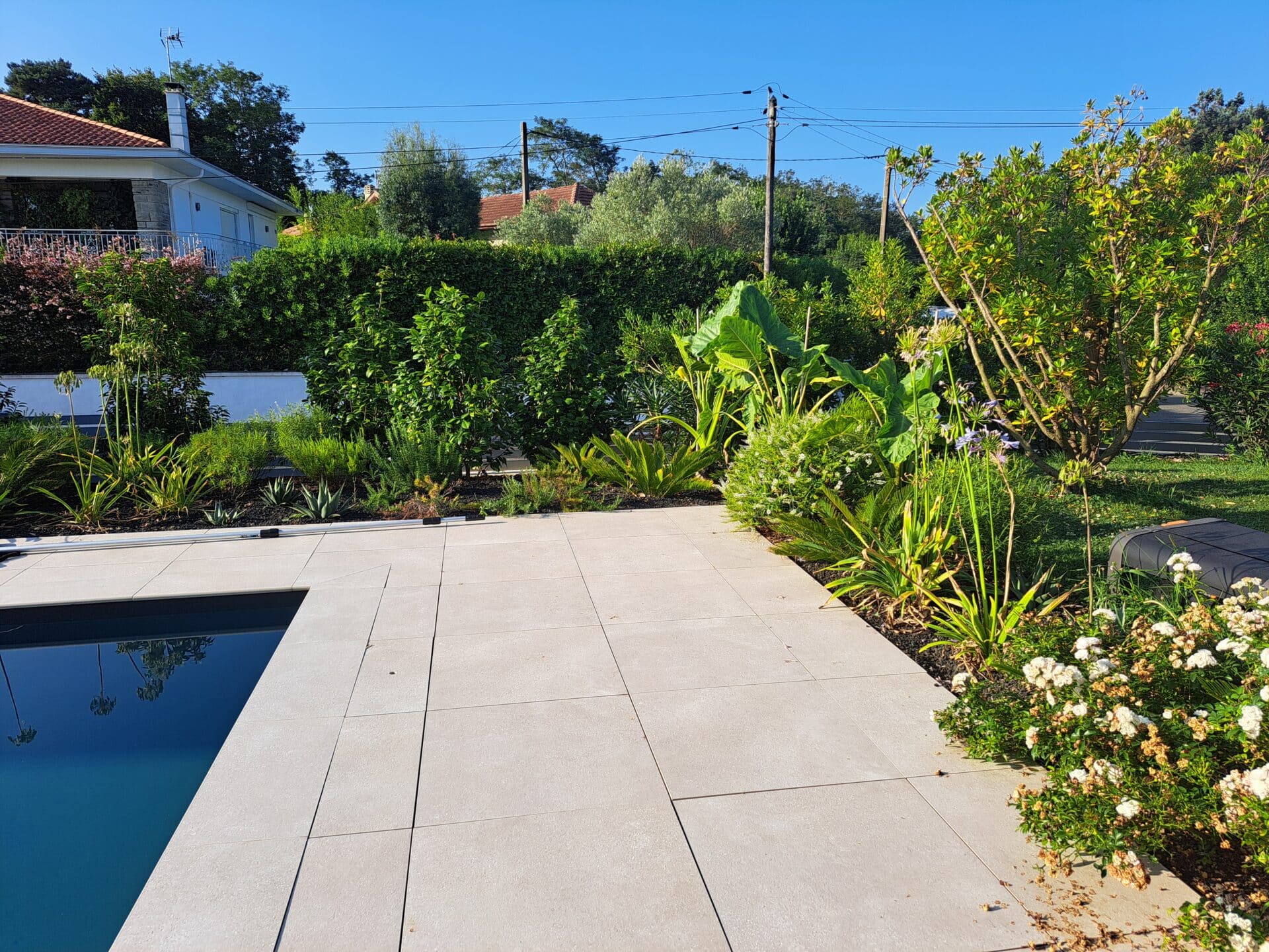 Terrasse en bois, pavés en pierre et pergola en bois composent ce jardin exotique conçu sur-mesure. Végétation luxuriante et matériaux naturels s’unissent pour créer un espace extérieur chaleureux, dépaysant et parfaitement intégré au cadre local.