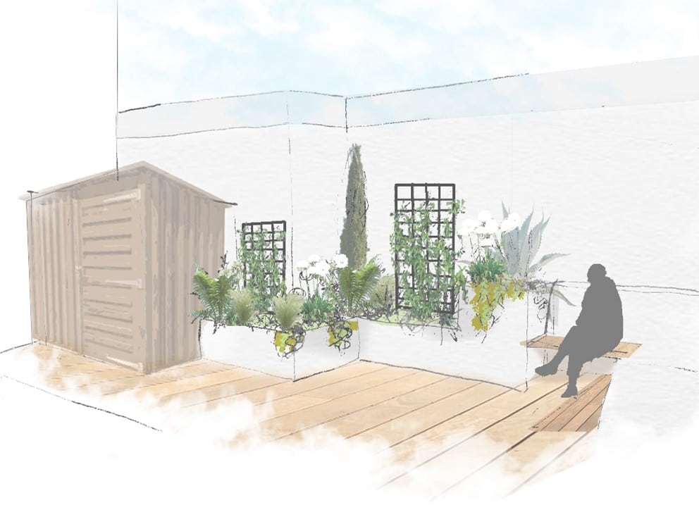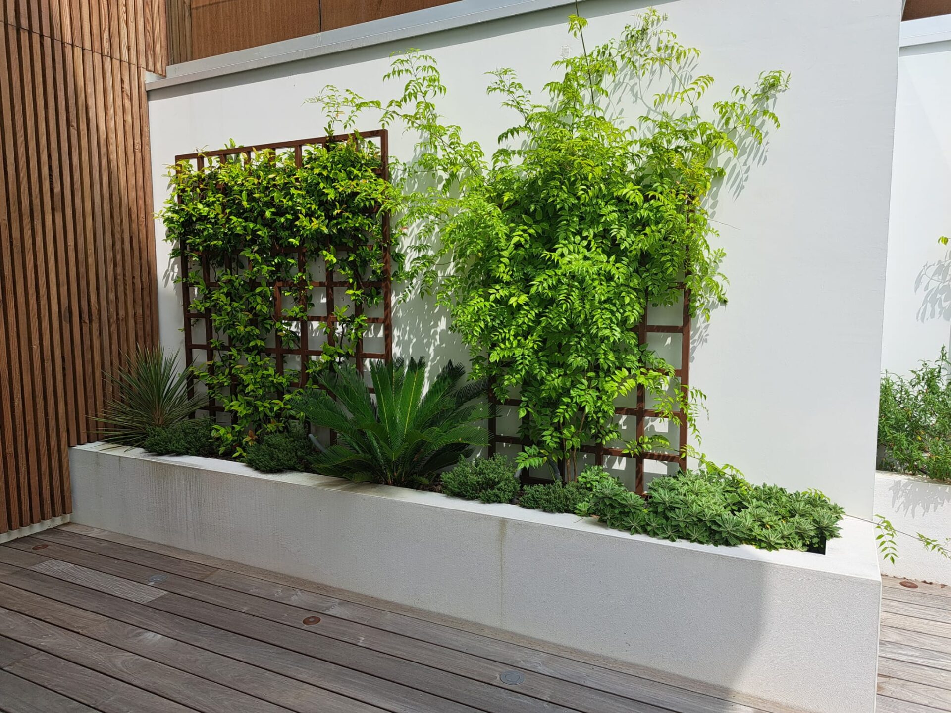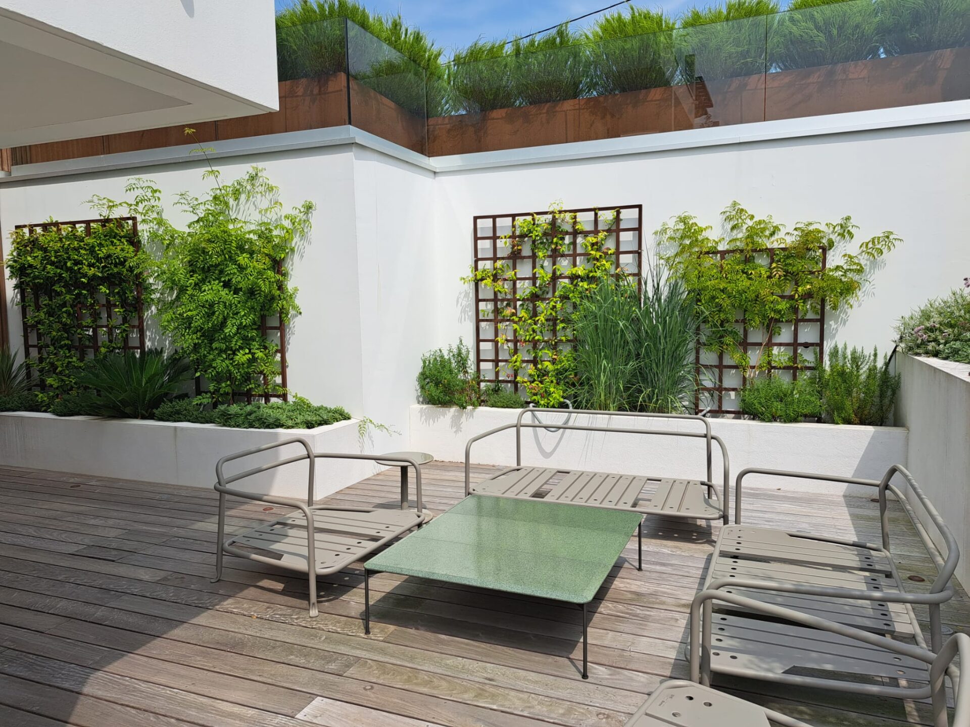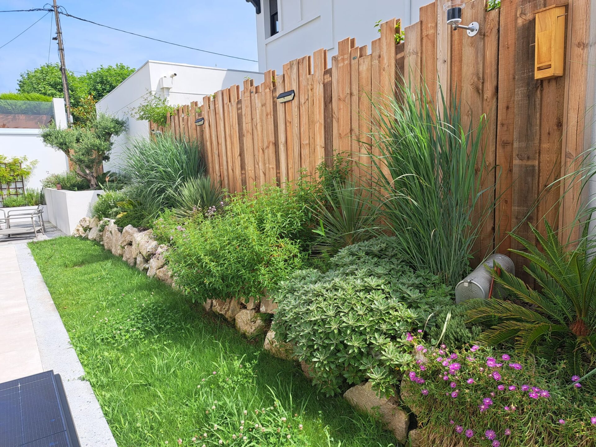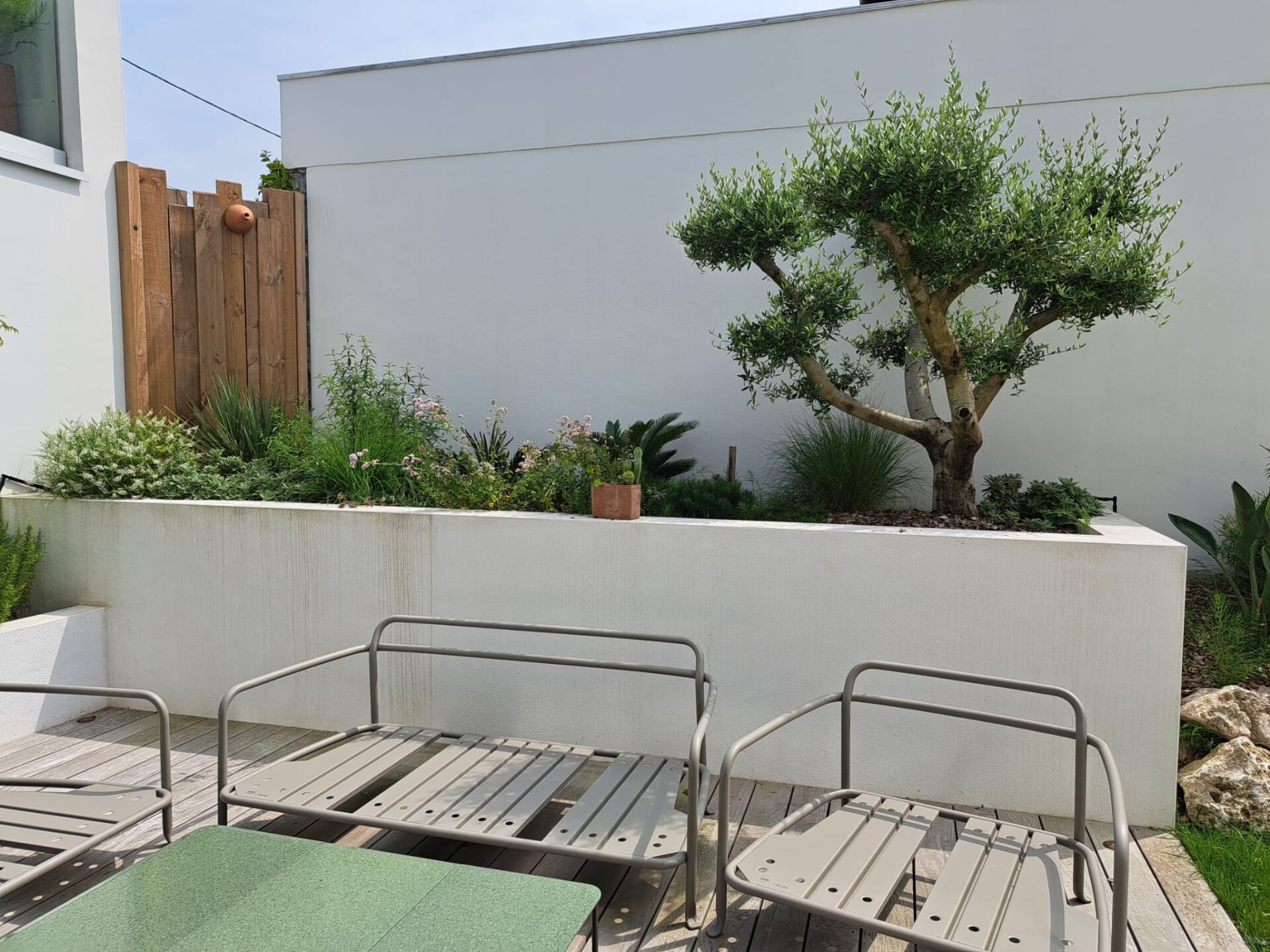 Un espace extérieur unique, conçu main dans la main avec le client, où terrasse en bois et végétaux soigneusement choisis créent une ambiance cosy et raffinée.